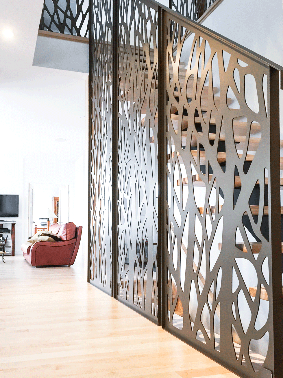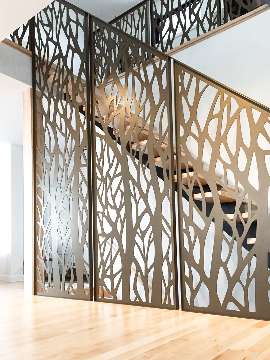 Garde d'escalier en acier avec motif et couleur personnalisée. Ce garde confère une ambiance organique et artistique dans l'espace de vie. À la fois artistique et utilitaire, il est exposé tel une oeuvre d'art entièrement personnalisée.