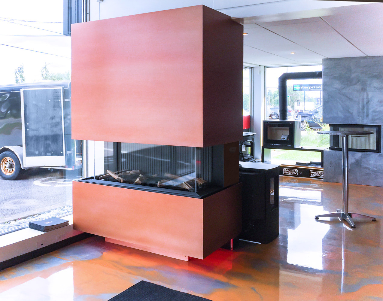 Revêtement de foyer en aluminium. Peinture couleur cuivre. L'aluminium peut être peint de la couleur de votre choix ! - Ce foyer est exposé chez Noréa Foyers Napert Signature (succursale de Québec)