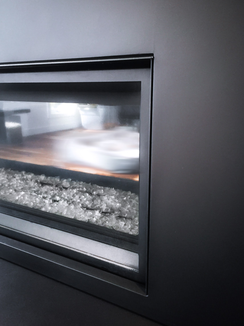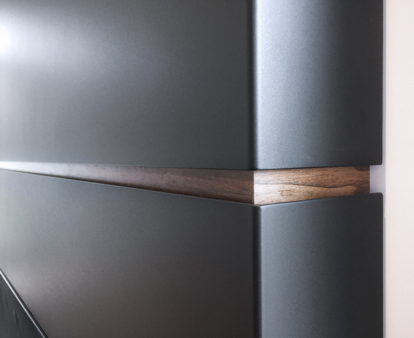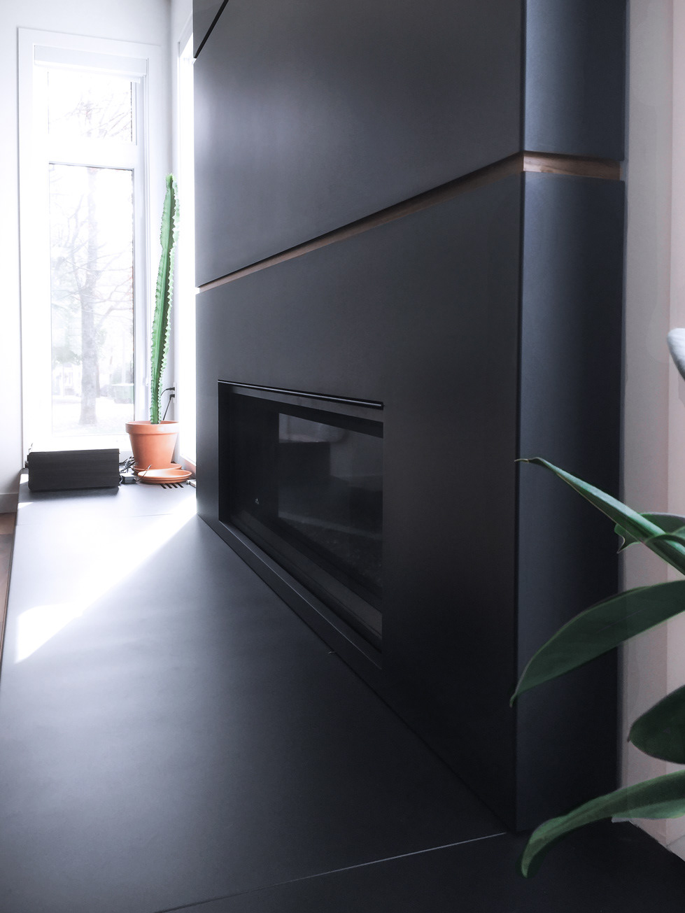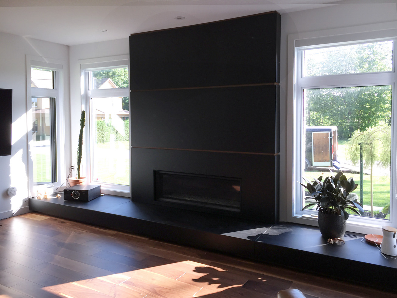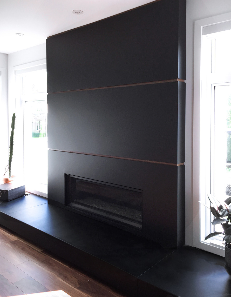 Revêtement de foyer en aluminium peint noir mat. Style flottant avec Insertions de lattes de bois entre les espaces. Tablette en acier à la base du foyer.